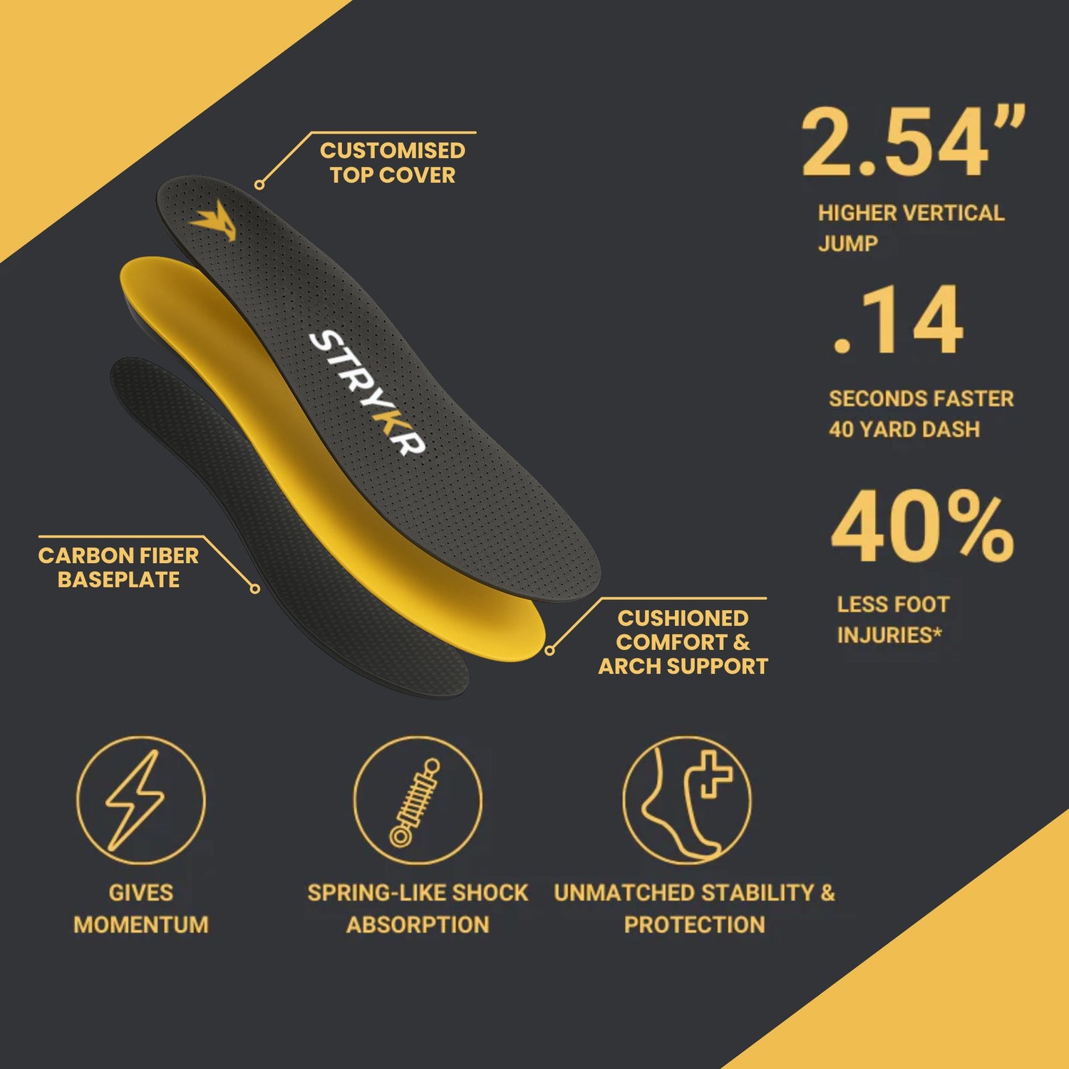 STRYKR Performance Insoles™ are engineered for athletes who demand more. With a full-length carbon fiber base, they store and return energy with every step. Each pair is custom-made to your sport and size, delivering the power, support, and cushioning you need to perform at your peak.